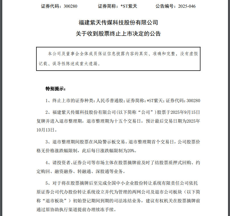 9月5日晚间,*ST紫天(300280)发布公告称,公司当日收到深交所下发的《关于福建紫天传媒科技股份有限公司股票终止上市的决定》,深交所决定终止公司股票上市交易。