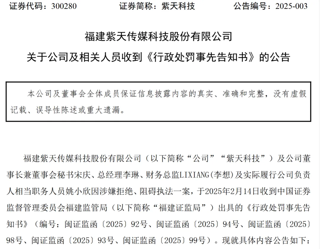“紫天科技无正当理由不按要求报送文件资料,已构成拒绝、阻碍执法行为,严重影响福建证监局对其有关检查工作正常进行,情节严重。”福建证监局表示。