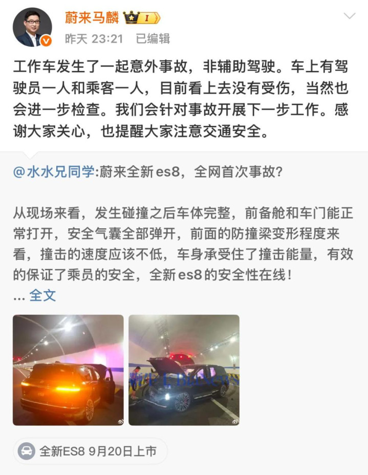 随后,蔚来品牌与传播助理副总裁马麟发文回应称,“工作车发生了一起意外事故,非辅助驾驶。车上有驾驶员一人和乘客一人,目前看上去没有受伤,当然也会进一步检查。我们会针对事故开展下一步工作。感谢大家关心,也提醒大家注意交通安全。”