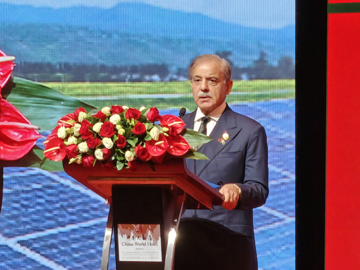 9月4日,第二届中国-巴基斯坦B2B投资峰会在北京举行,巴基斯坦总理夏巴兹发表演讲。白波摄